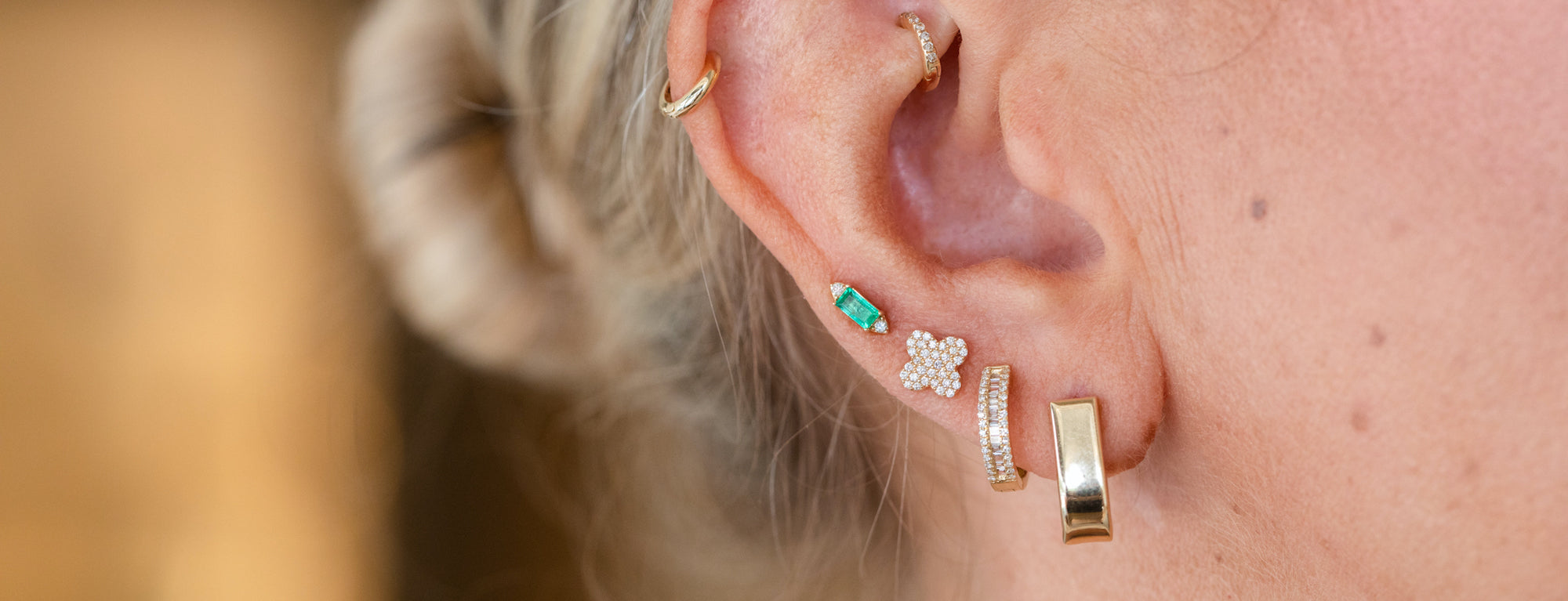 If you have multiple piercings, we have great unique earring options for second piercing holes. Our diamond comma crawler earrings climb up the ear for an edgy, sophisticated look. It’s all about creating a curated ear, so don’t be afraid to mix and match studs – your earrings don’t have to match!